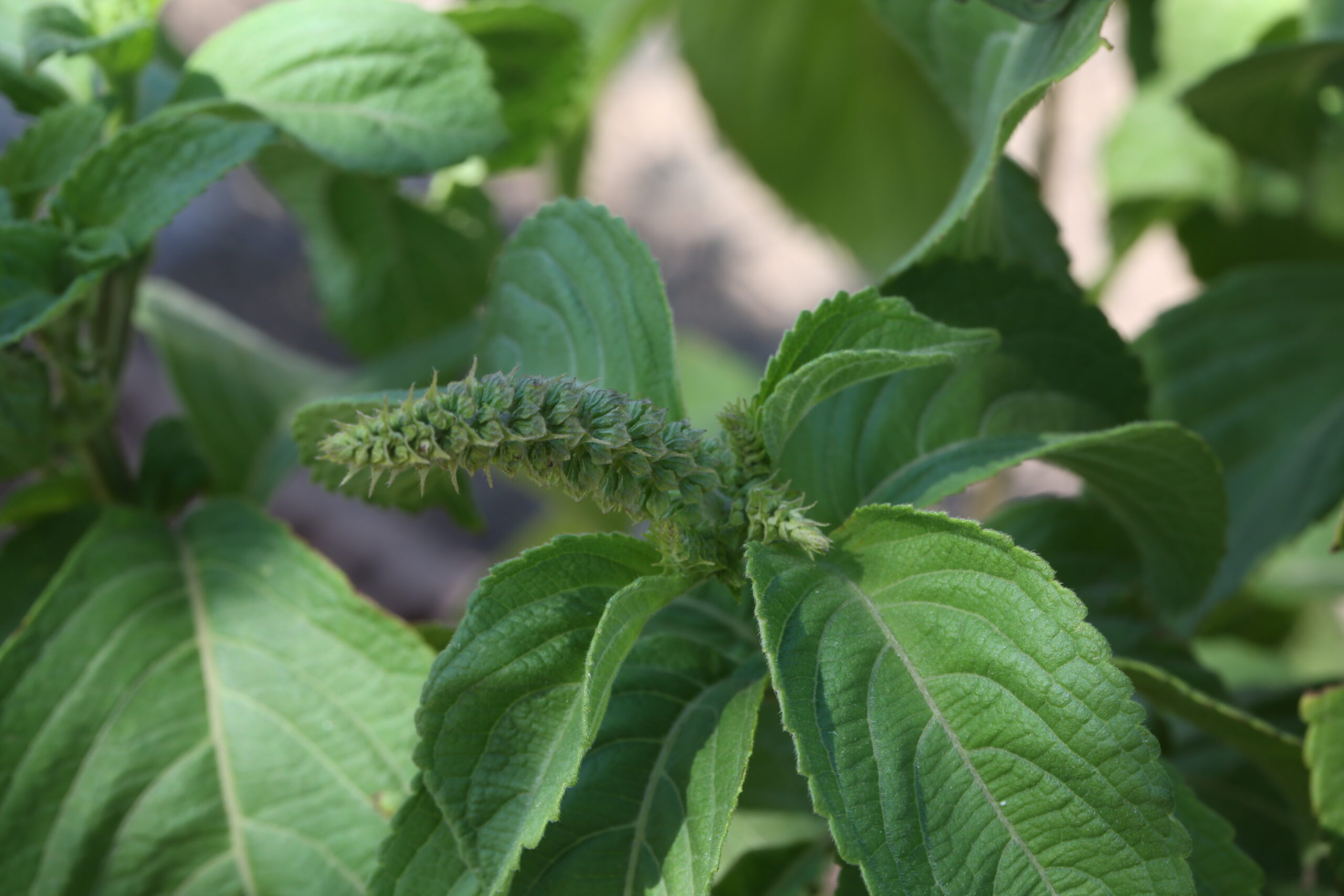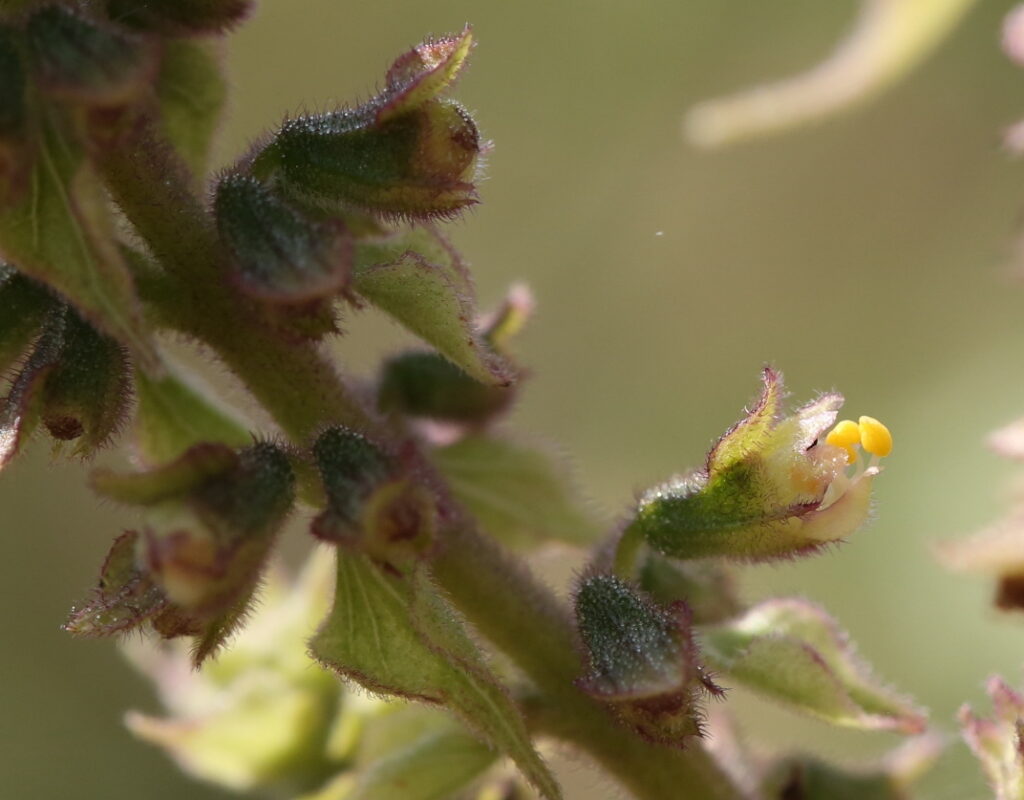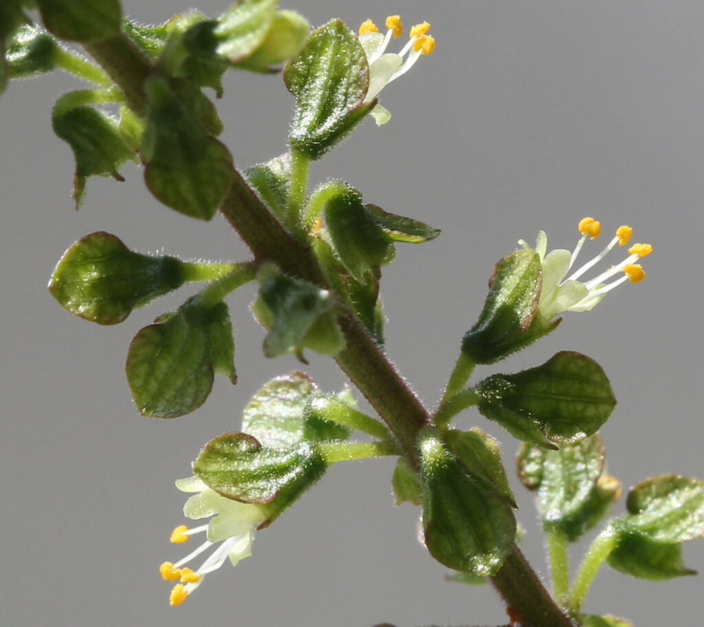 La troisième section, dénommée “Gymnocyum”, se caractérise par des étamines postérieures glabres. Elle comprend Ocimum campechianum.